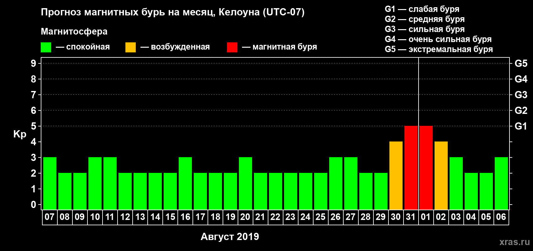 Прогноз магнитных бурь в Келоуне на 7 августа 2019 года