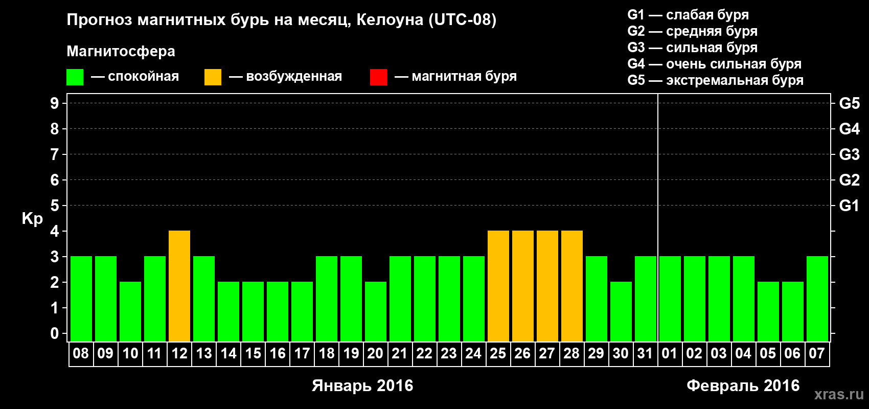 Прогноз магнитных бурь в Келоуне на 8 января 2016 года