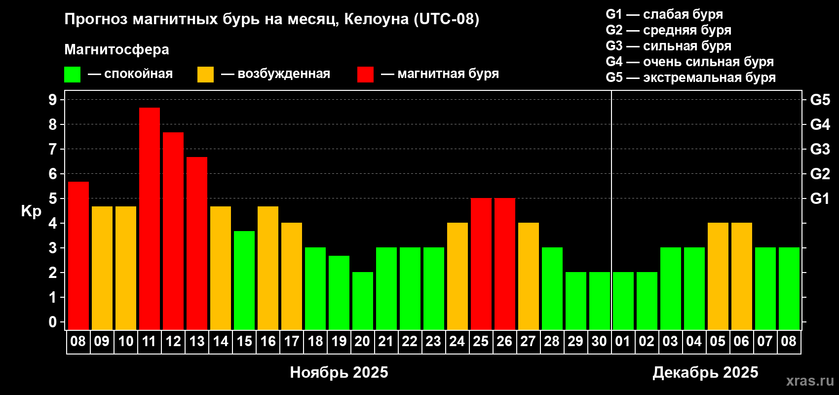 Прогноз магнитных бурь в Келоуне на 8 ноября 2025 года