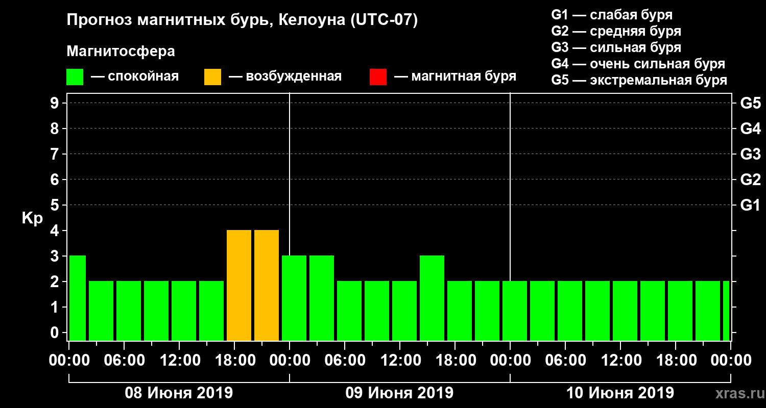 Прогноз магнитных бурь в Келоуне на 8 июня 2019 года