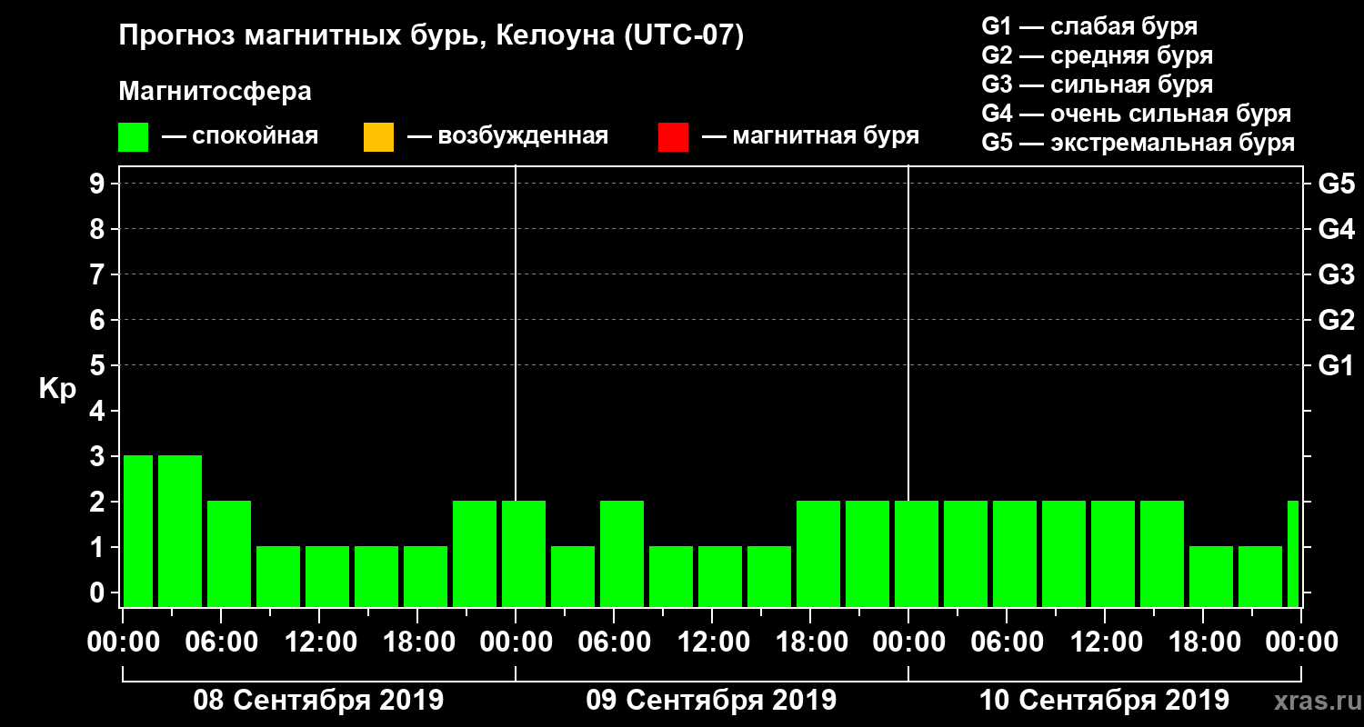 Прогноз магнитных бурь в Келоуне на 8 сентября 2019 года