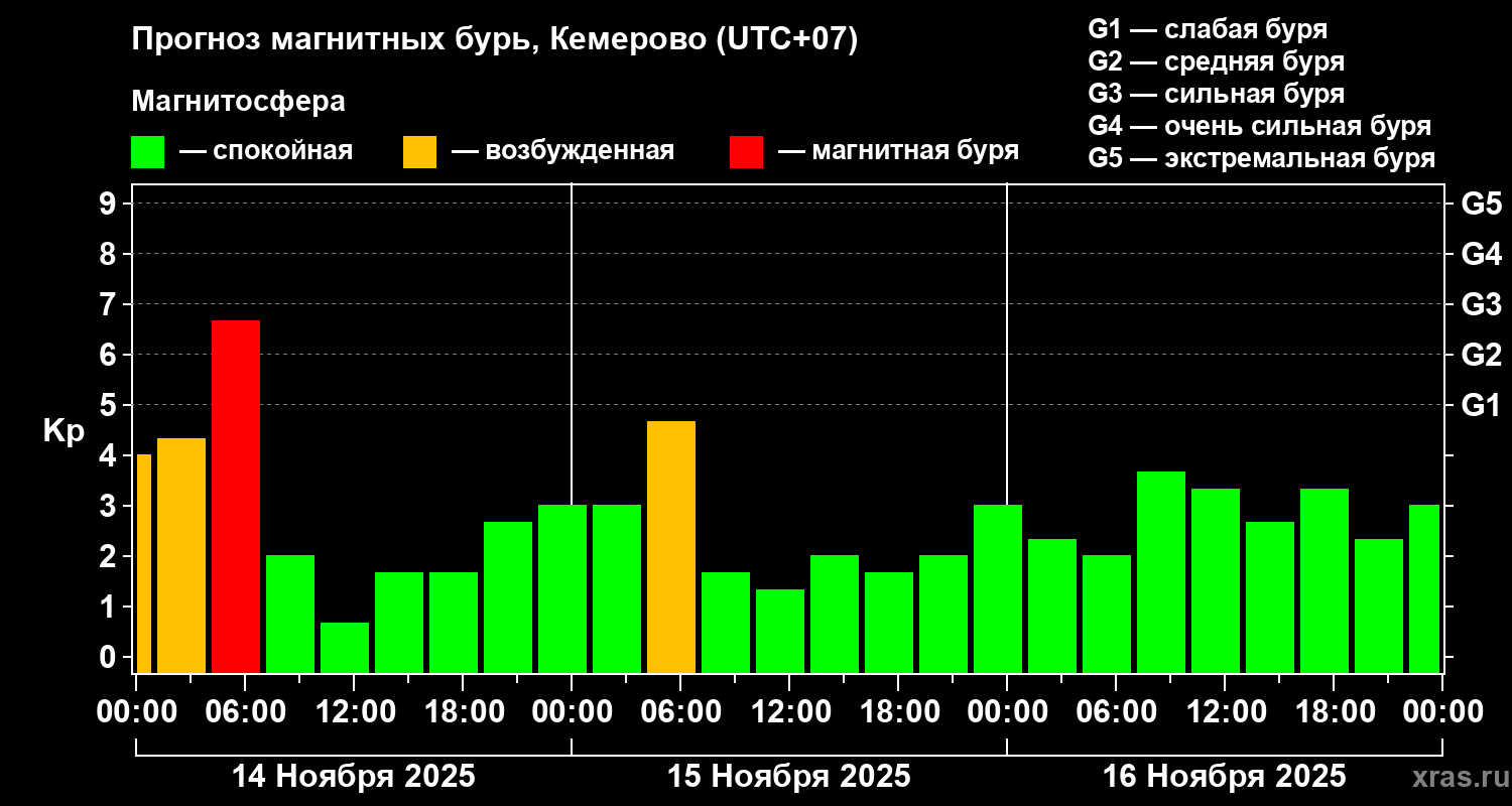 Прогноз магнитных бурь Кемерово — 14 ноября 2025 года