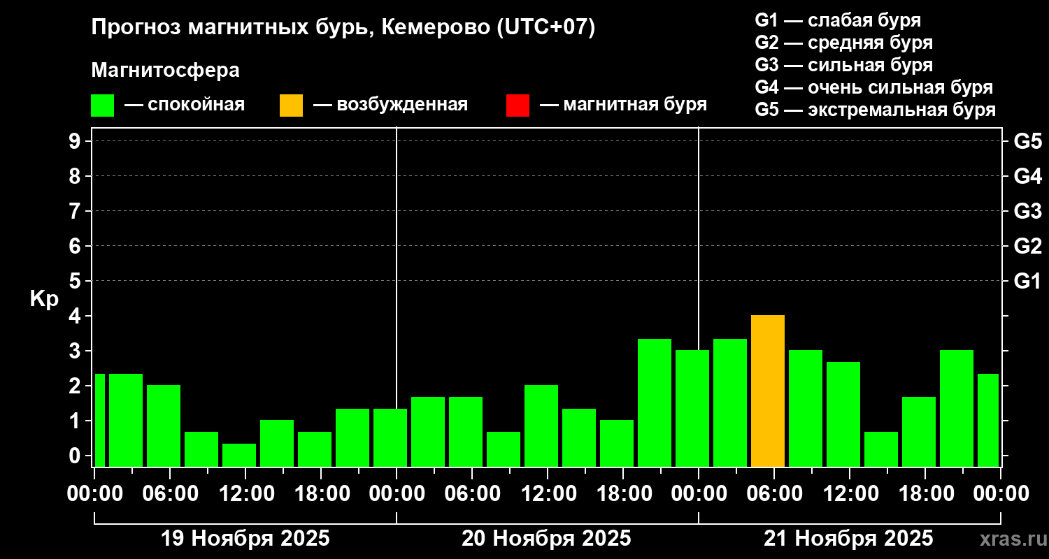Прогноз магнитных бурь Кемерово — 19 ноября 2025 года