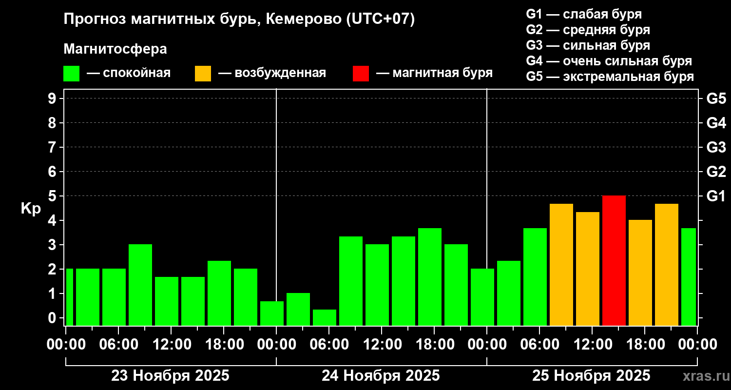 Прогноз магнитных бурь Кемерово — 23 ноября 2025 года