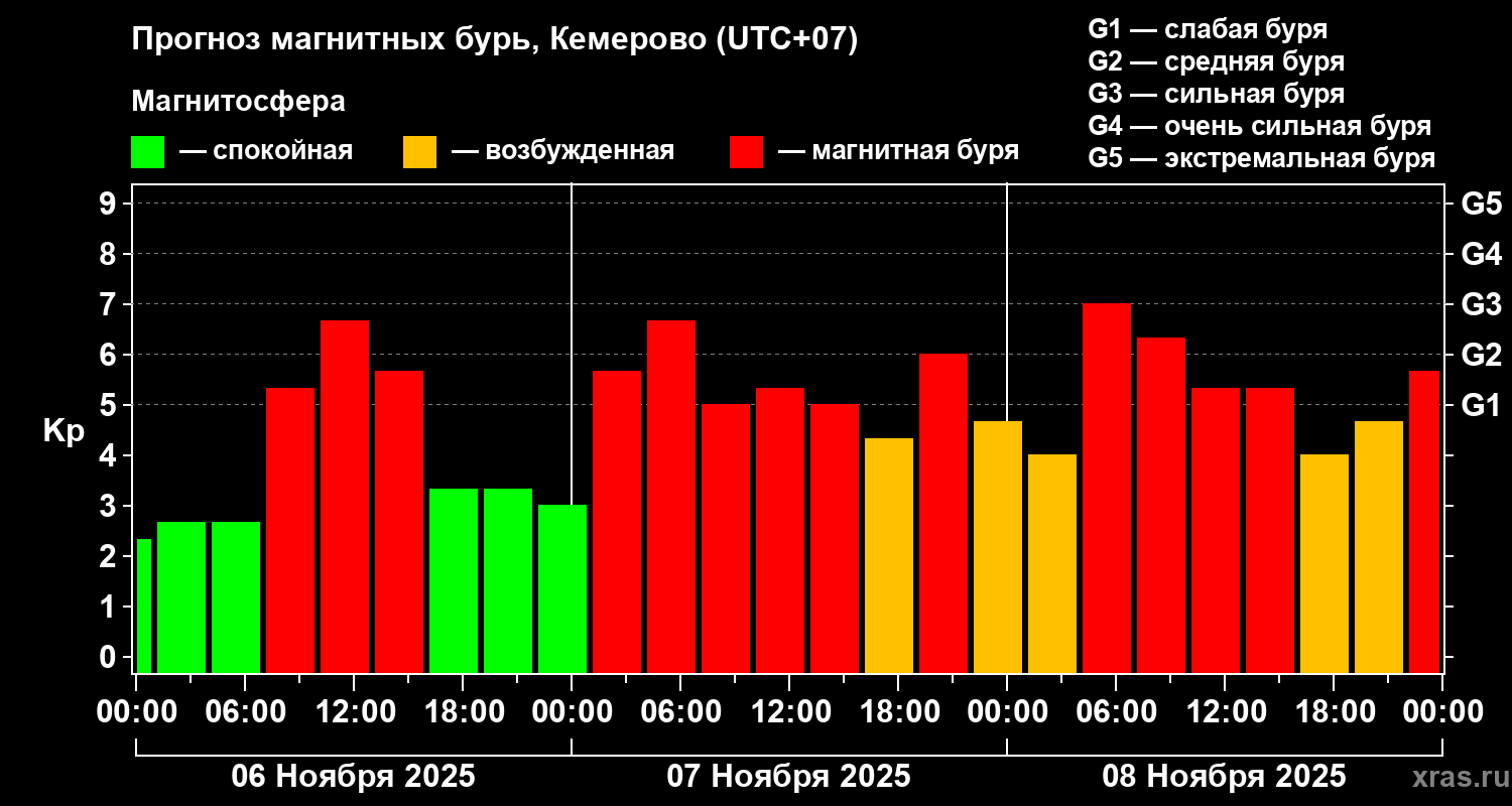 Прогноз магнитных бурь Кемерово — 6 ноября 2025 года
