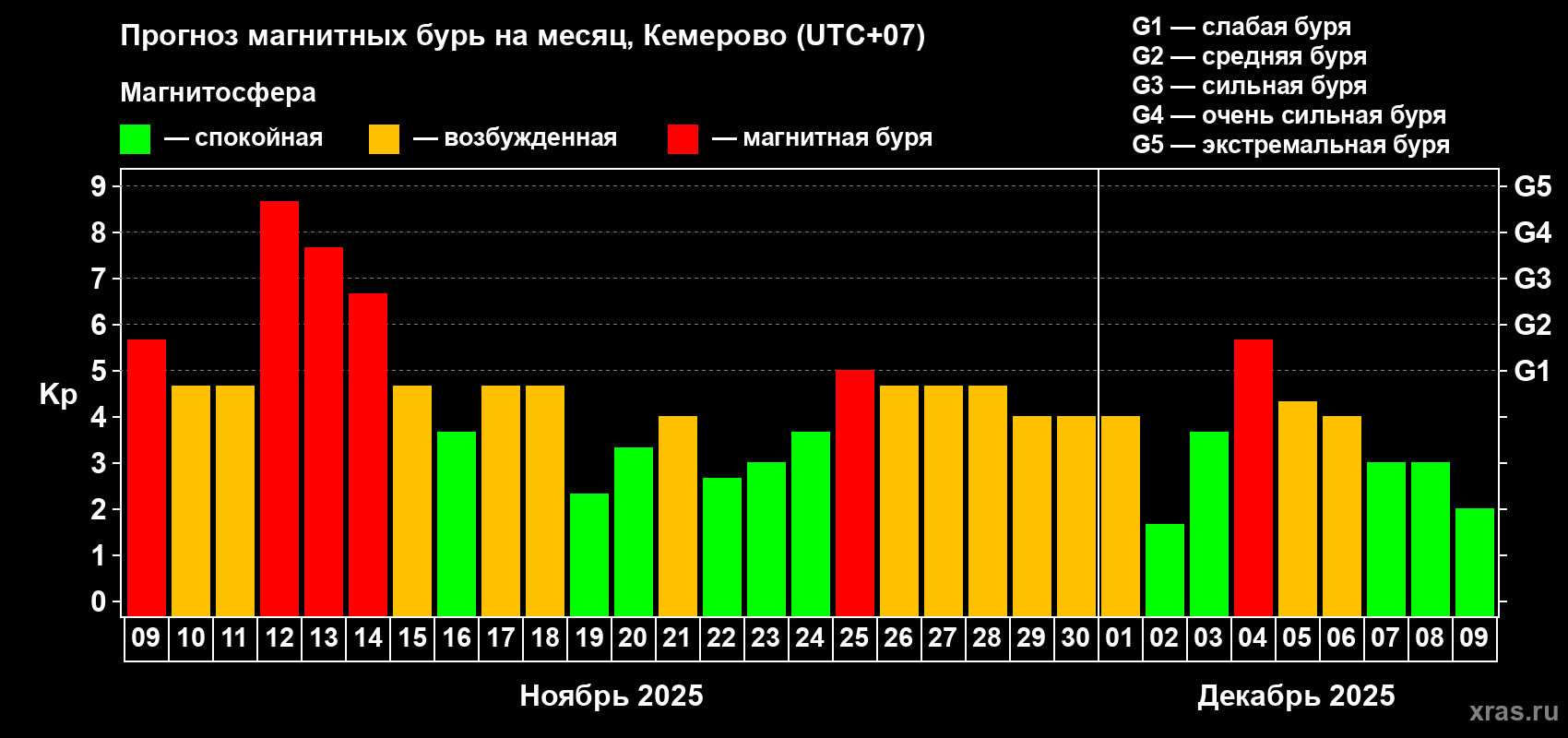 Прогноз магнитных бурь Кемерово — 9 ноября 2025 года