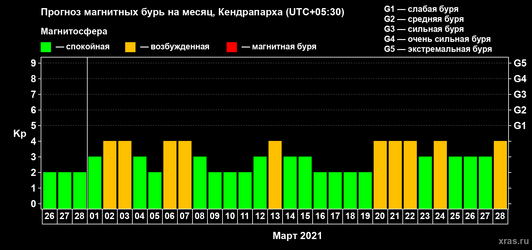 Прогноз магнитных бурь в Кендрапархе — 26 февраля 2021 года