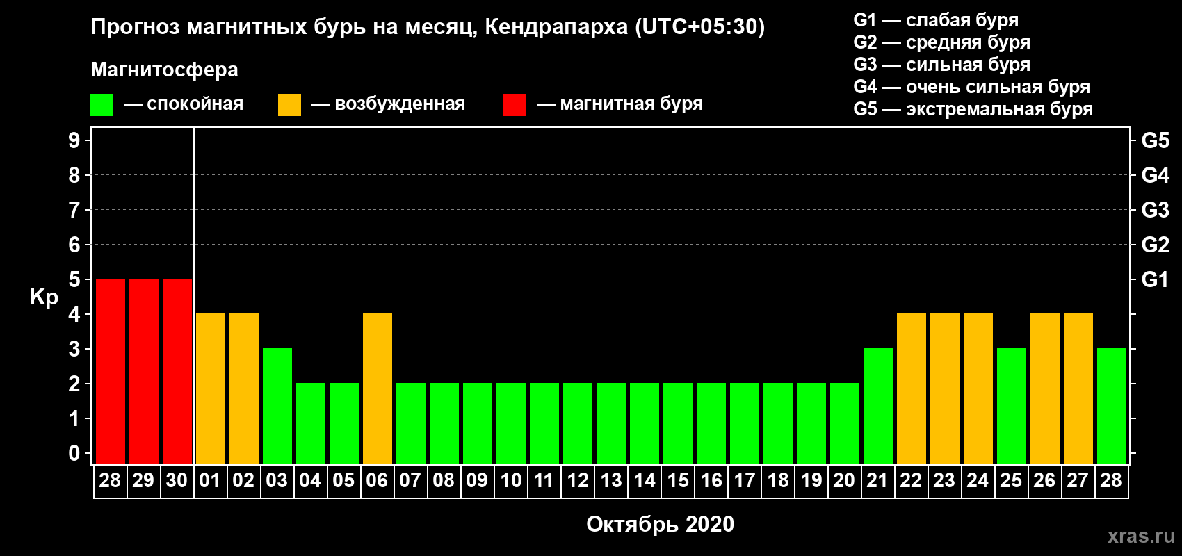 Прогноз магнитных бурь в Кендрапархе — 28 сентября 2020 года
