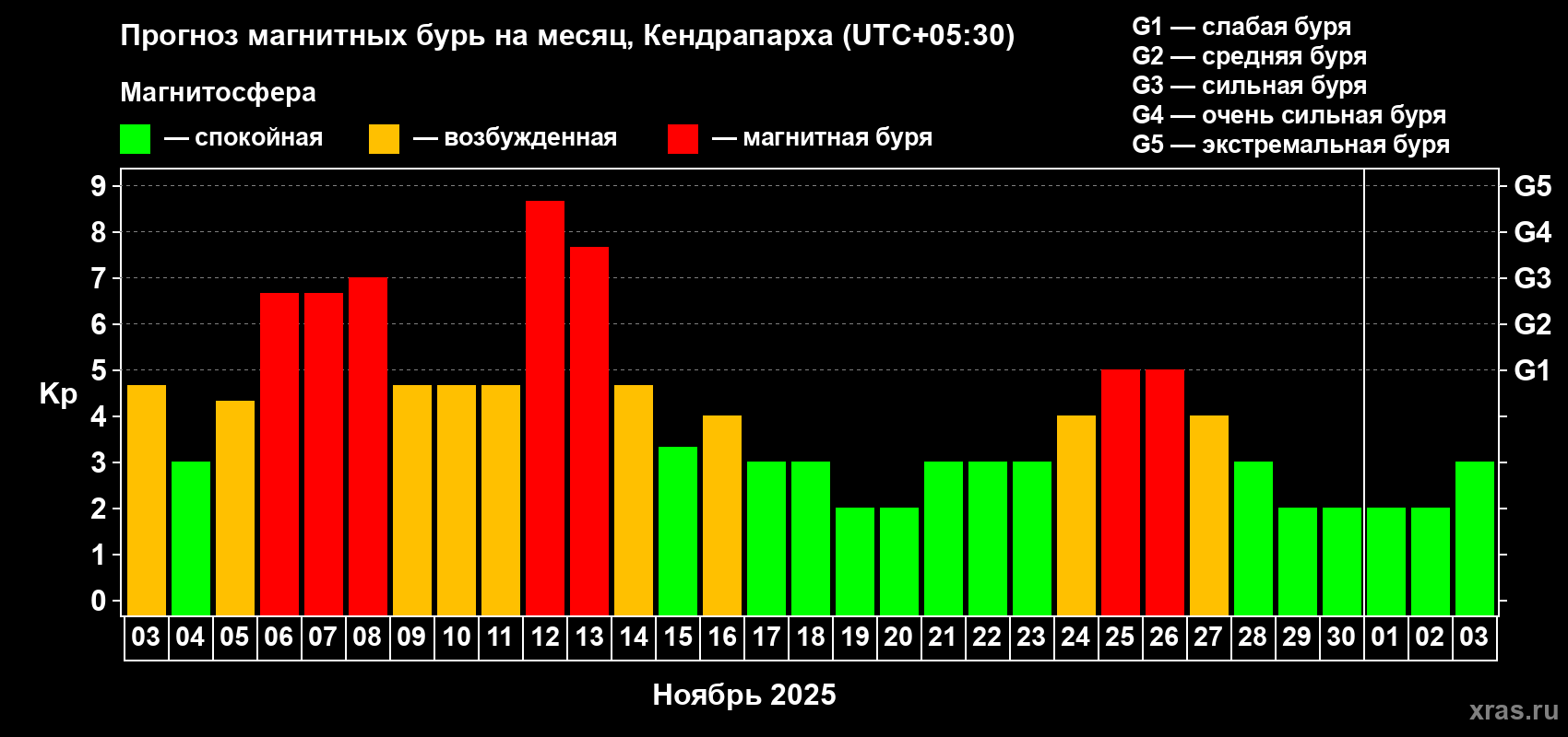 Прогноз магнитных бурь в Кендрапархе — 3 ноября 2025 года