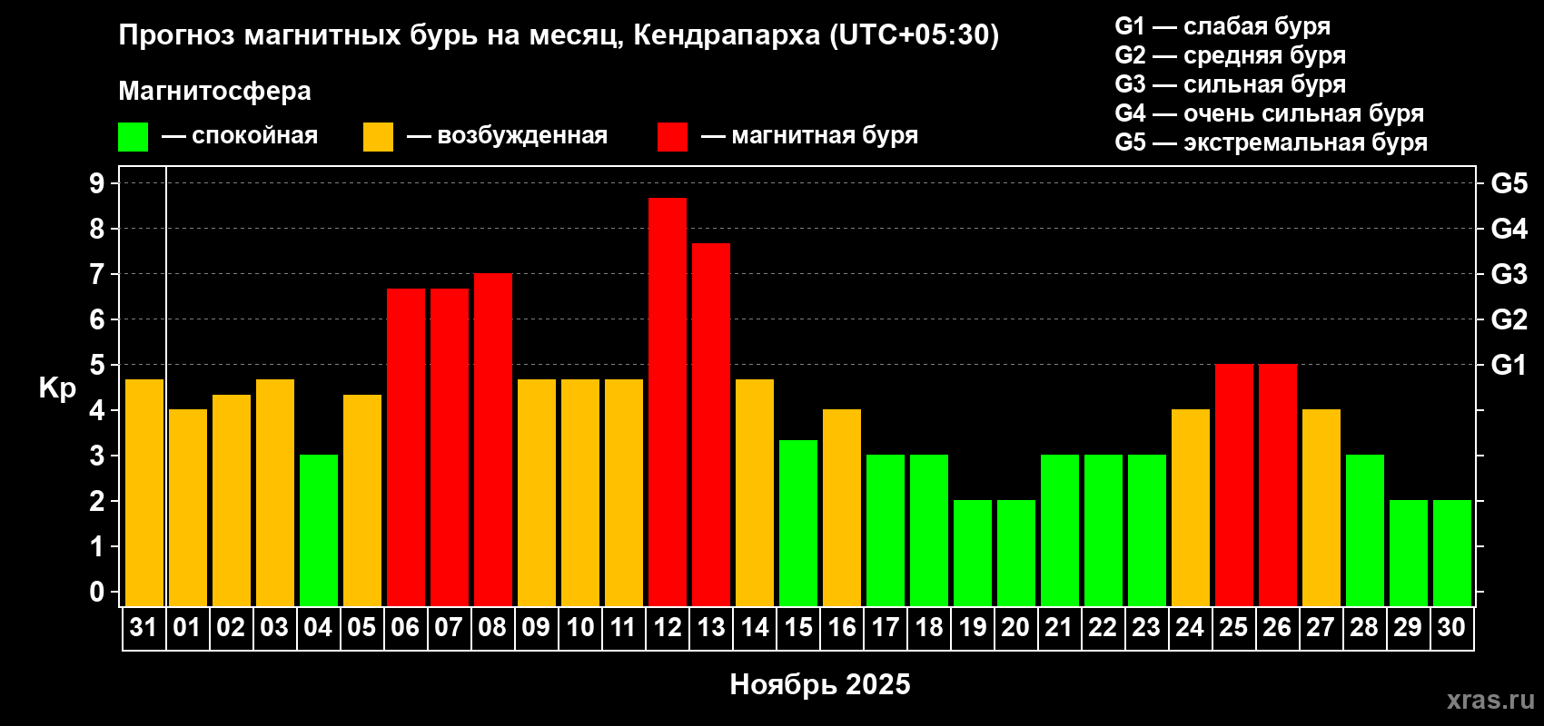 Прогноз магнитных бурь в Кендрапархе — 31 октября 2025 года