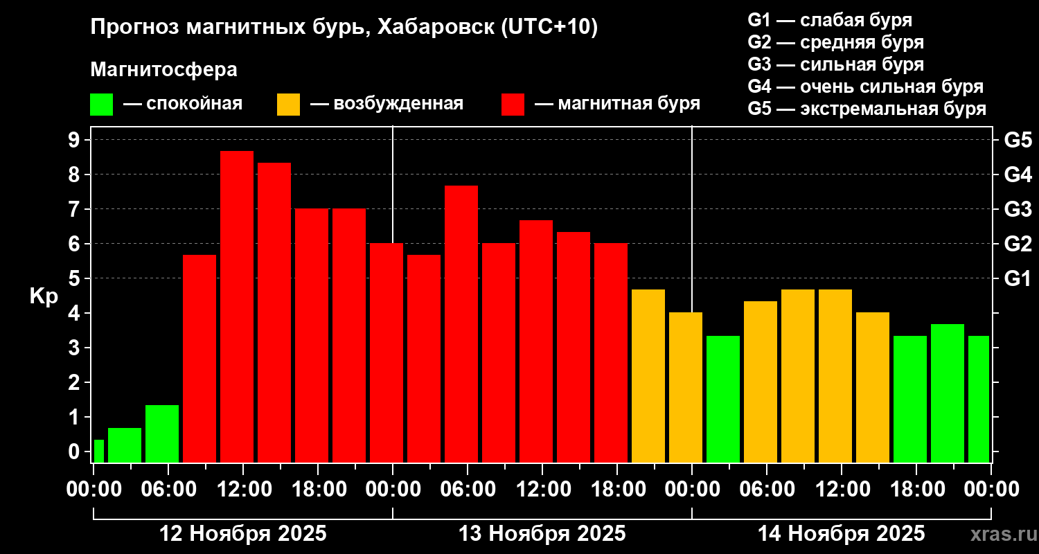 Прогноз магнитных бурь в Хабаровске — 12 ноября 2025 года