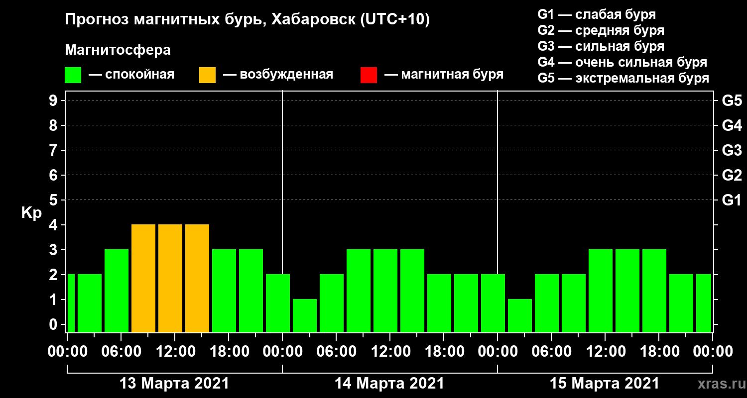 Прогноз магнитных бурь в Хабаровске — 13 марта 2021 года