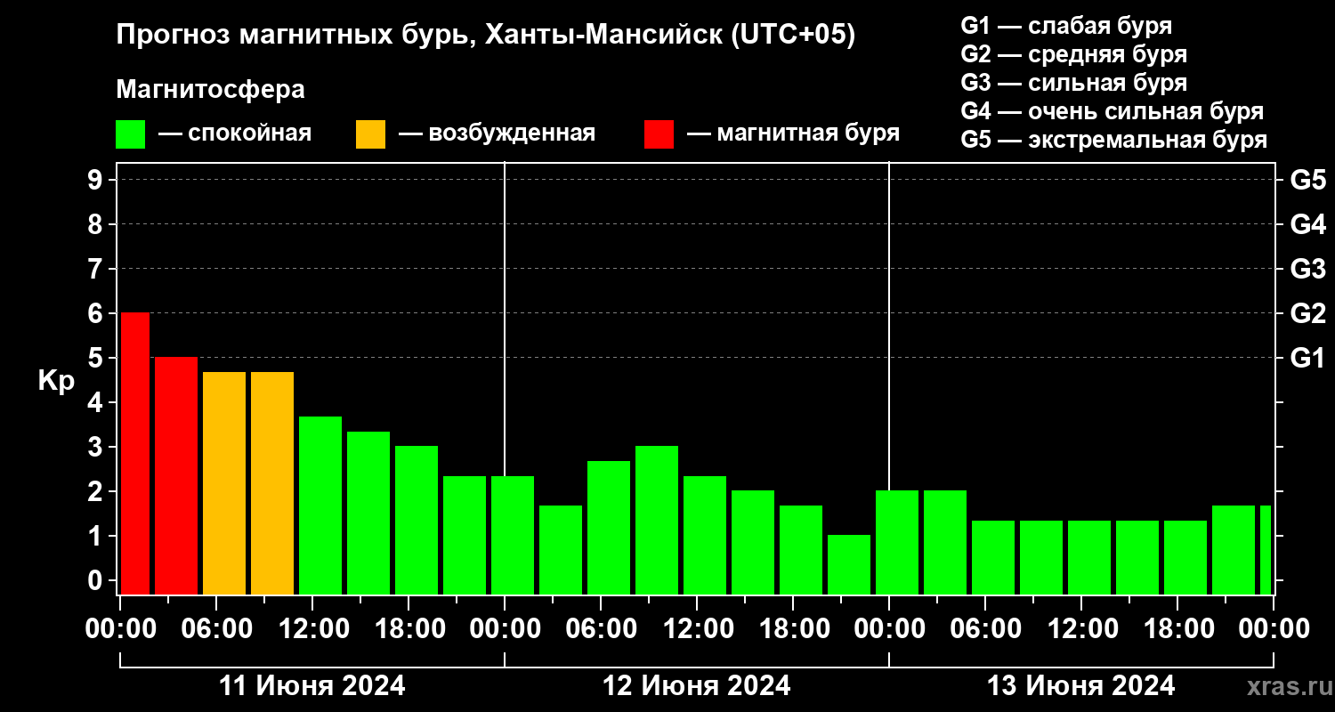 Прогноз магнитных бурь в Ханты-Мансийске на 11 июня 2024 года