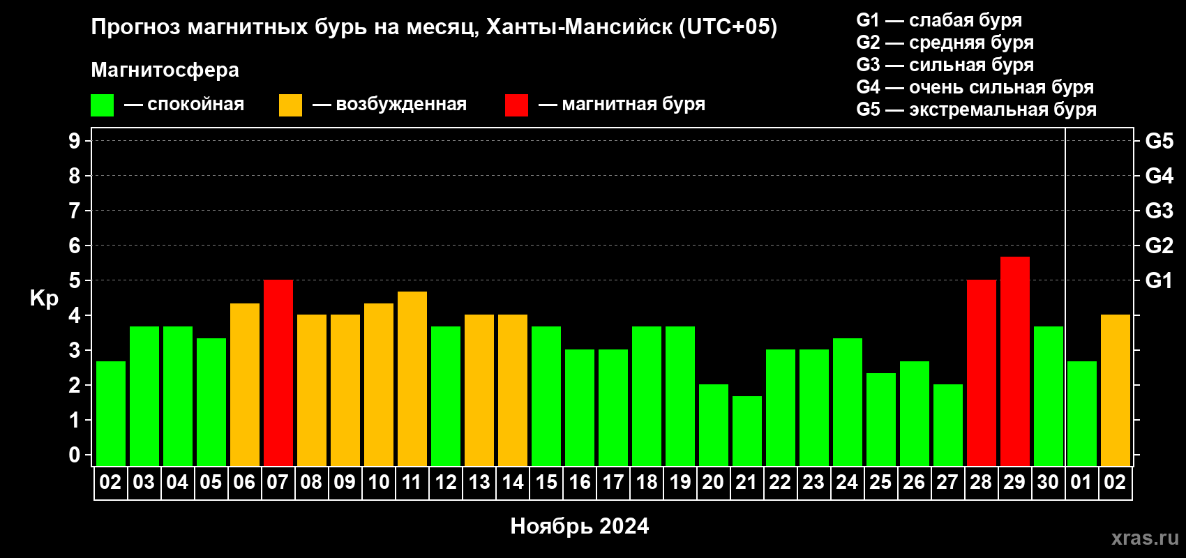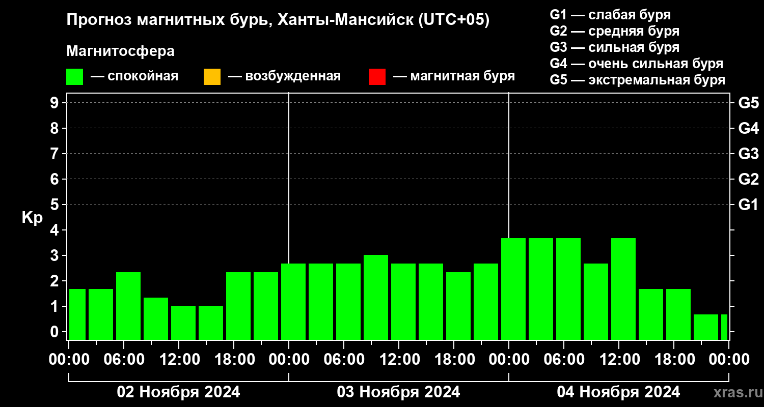 Прогноз магнитных бурь в Ханты-Мансийске на 2 ноября 2024 года