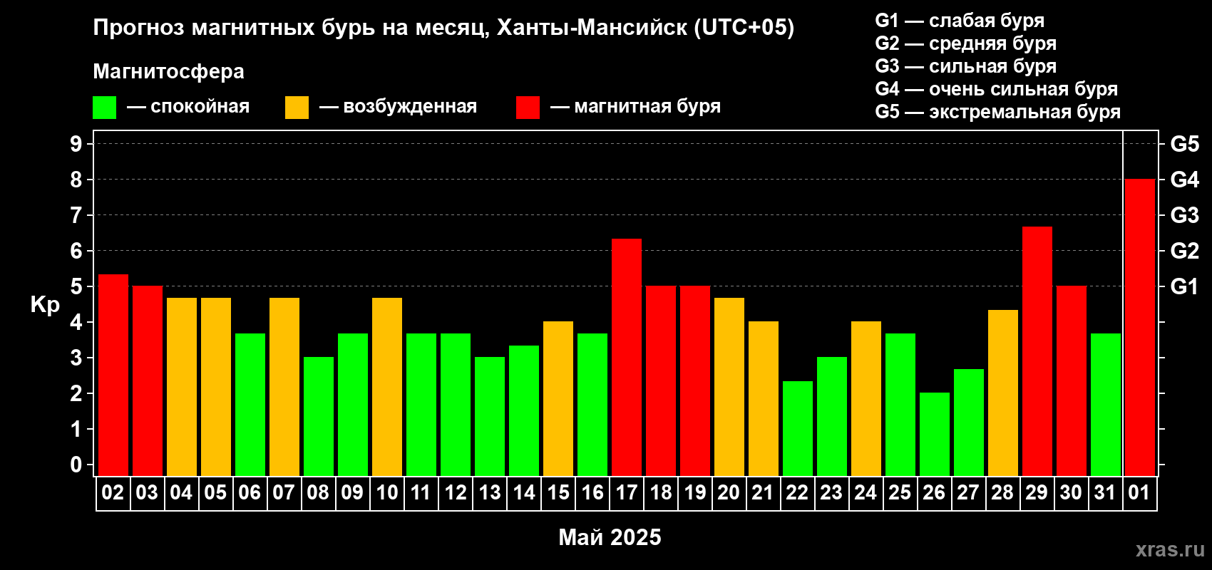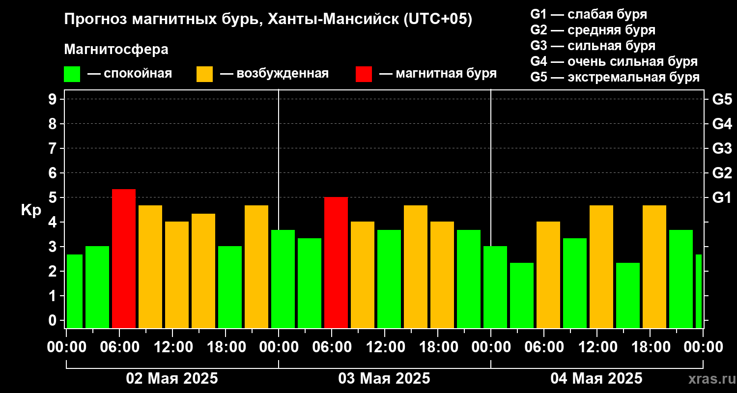 Прогноз магнитных бурь в Ханты-Мансийске на 2 мая 2025 года
