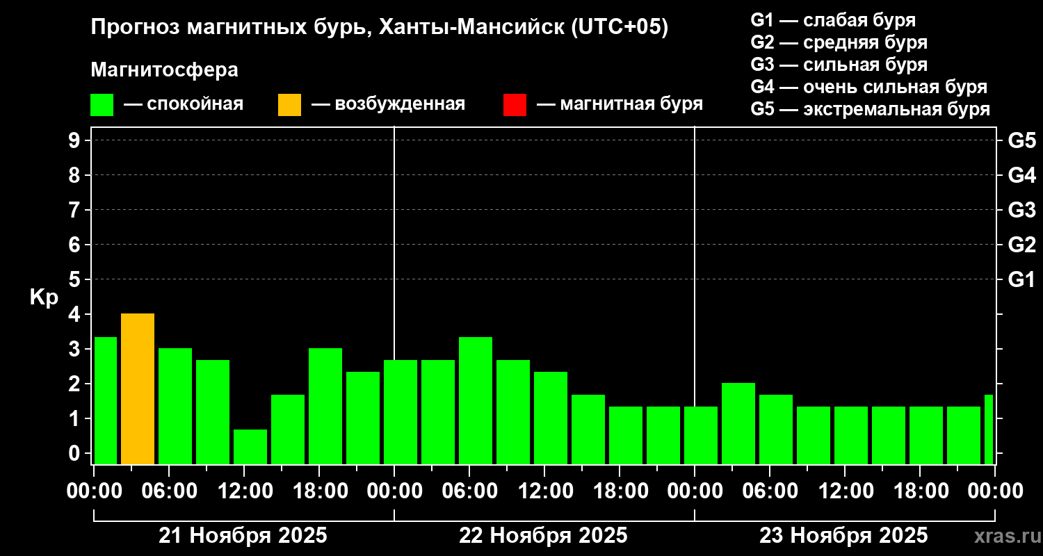 Прогноз магнитных бурь в Ханты-Мансийске на 21 ноября 2025 года