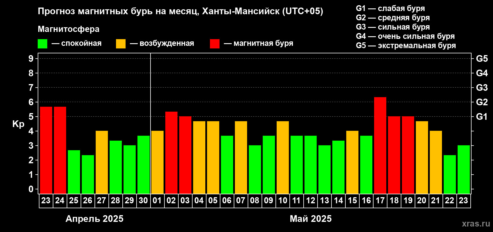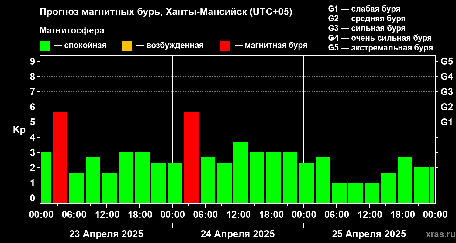 Прогноз магнитных бурь в Ханты-Мансийске на 23 апреля 2025 года
