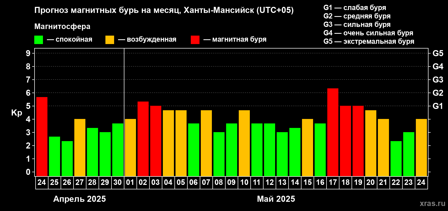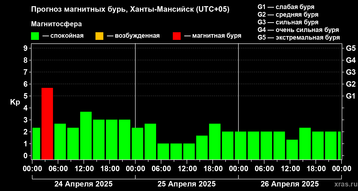 Прогноз магнитных бурь в Ханты-Мансийске на 24 апреля 2025 года