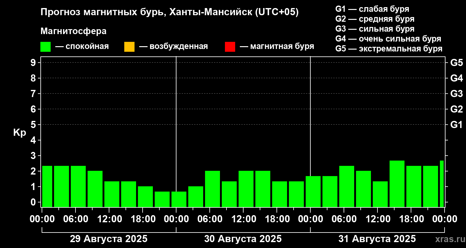 Прогноз магнитных бурь в Ханты-Мансийске на 29 августа 2025 года