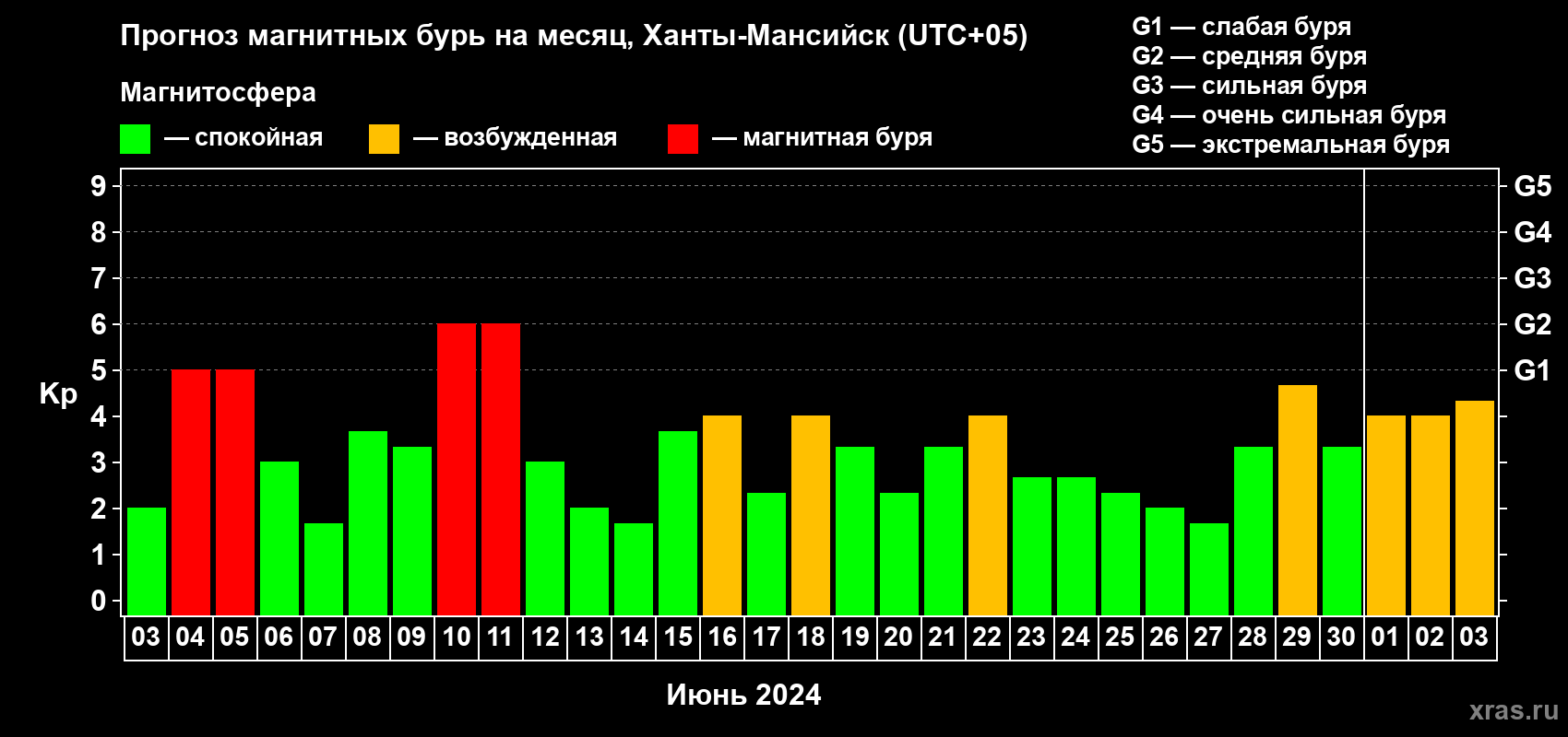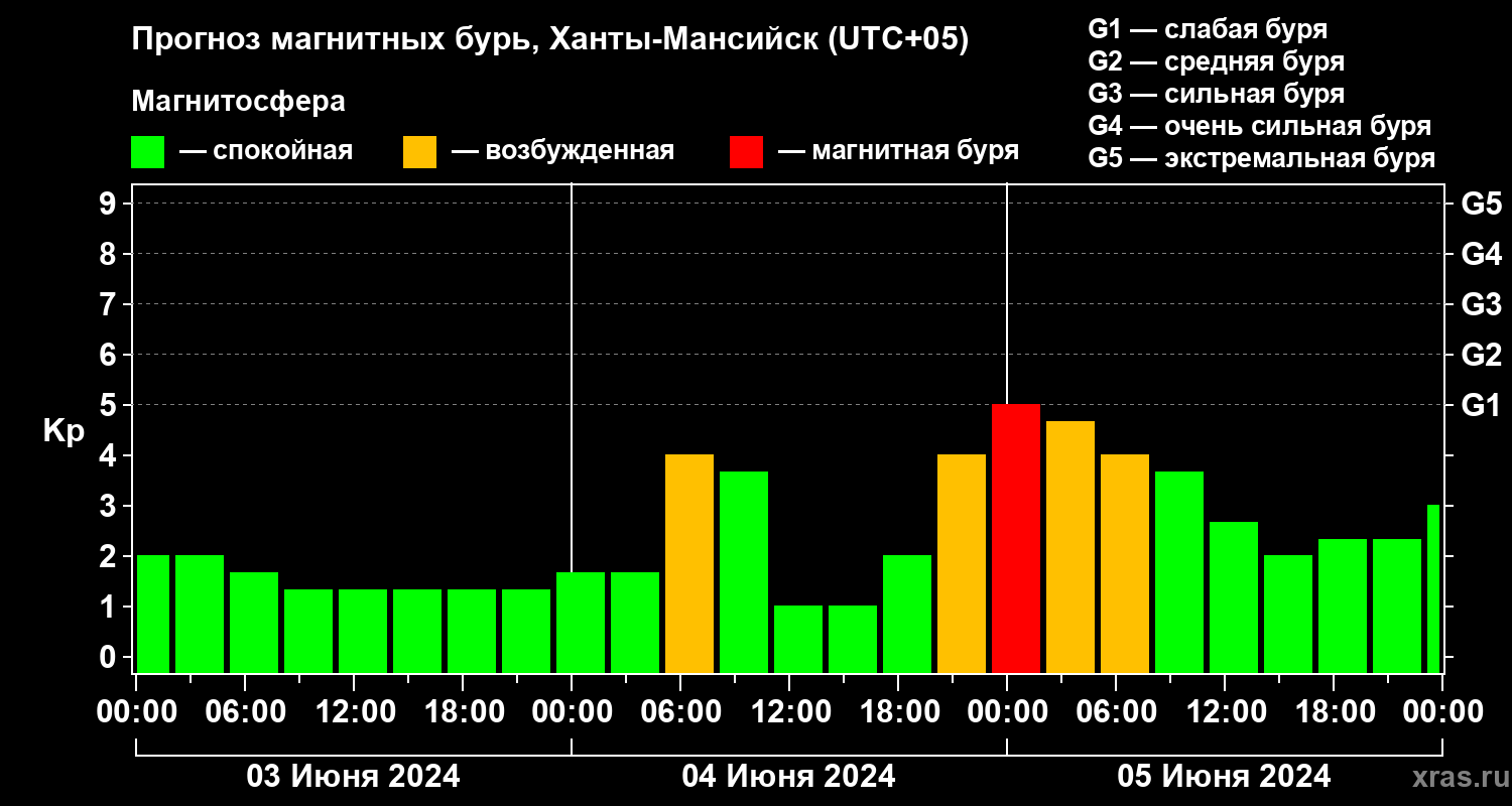 Прогноз магнитных бурь в Ханты-Мансийске на 3 июня 2024 года