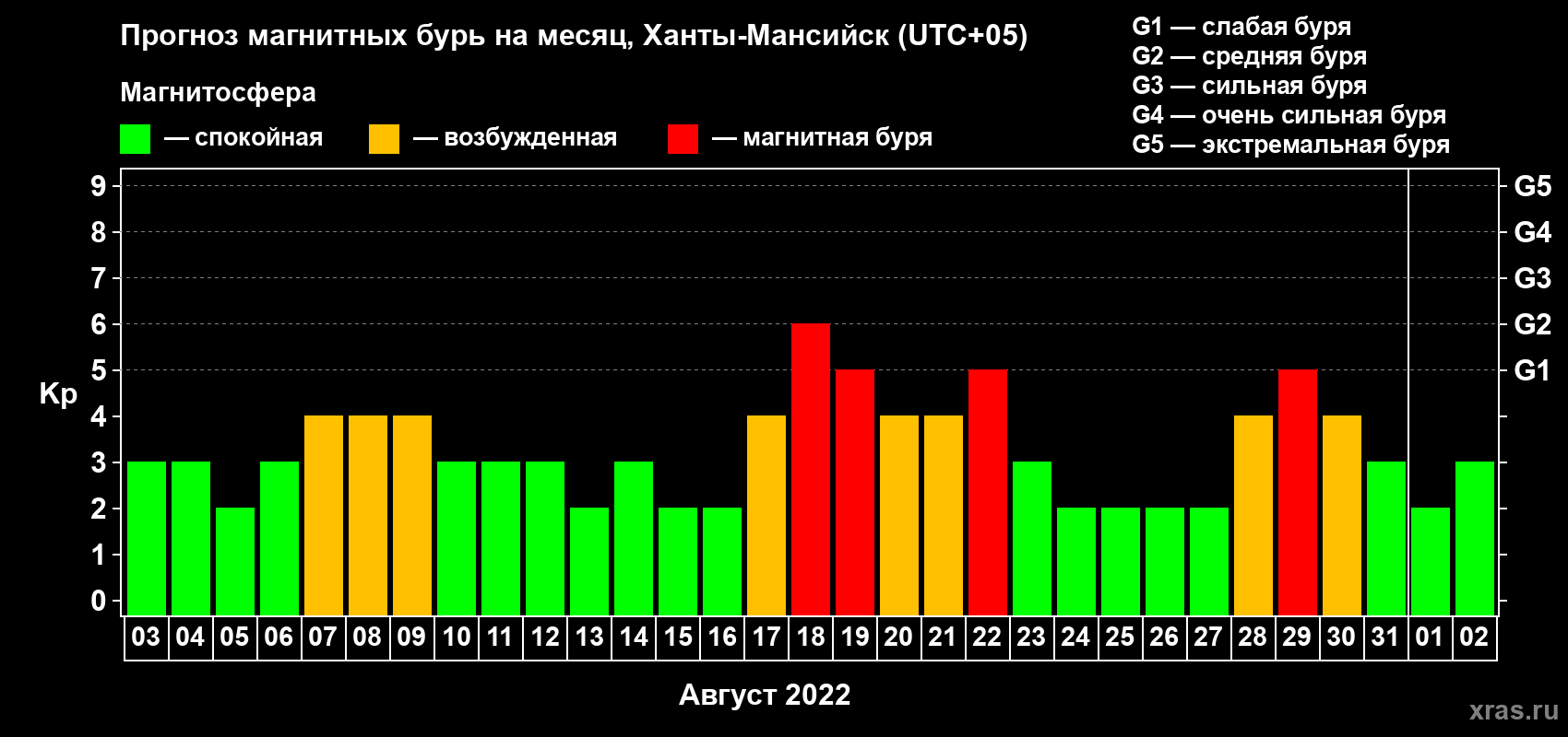 Прогноз магнитных бурь в Ханты-Мансийске на 3 августа 2022 года