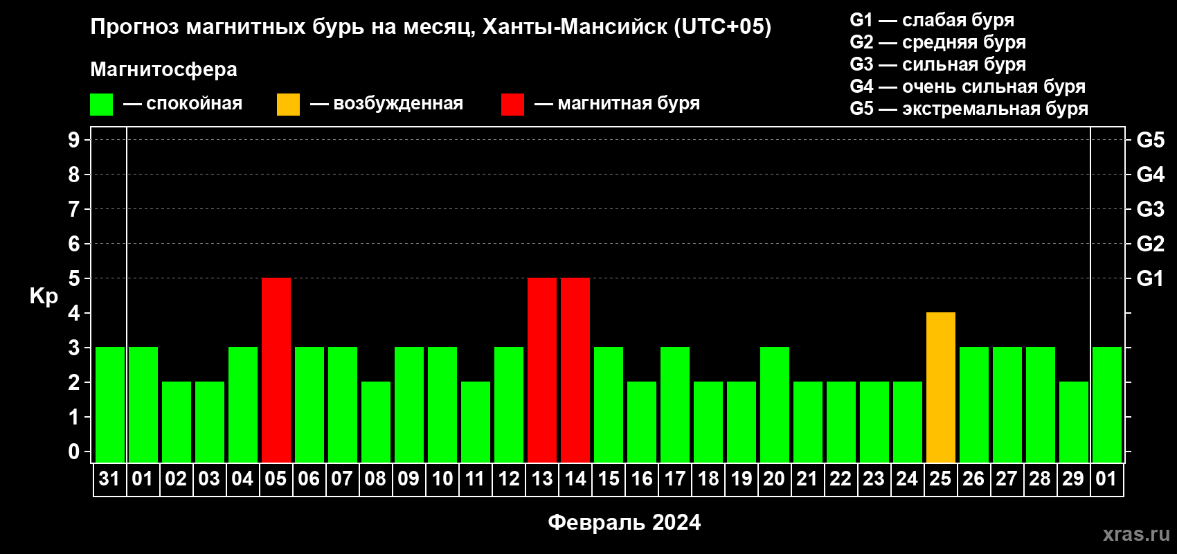 Прогноз магнитных бурь в Ханты-Мансийске на 31 января 2024 года