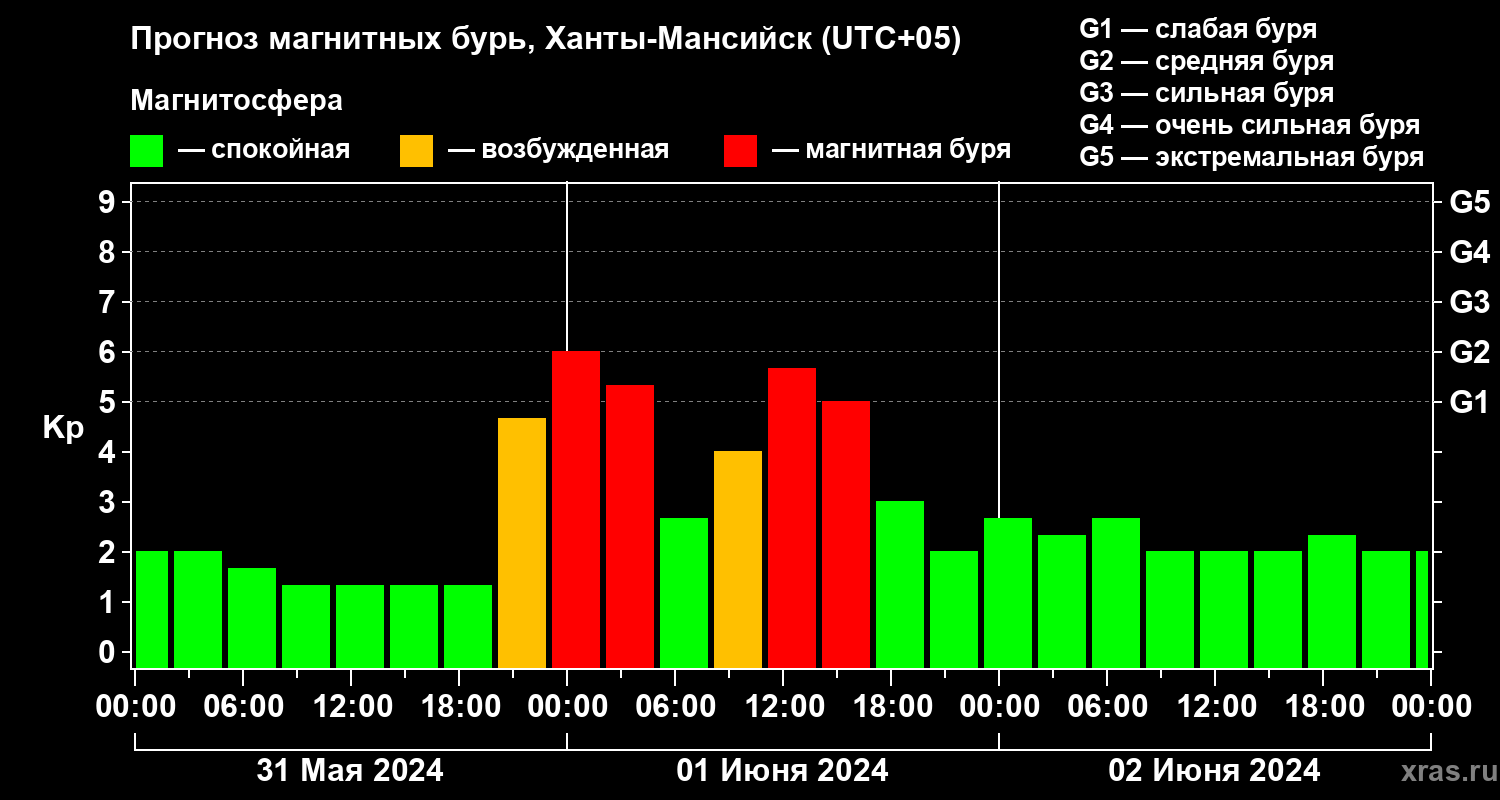 Прогноз магнитных бурь в Ханты-Мансийске — 31 мая 2024 года