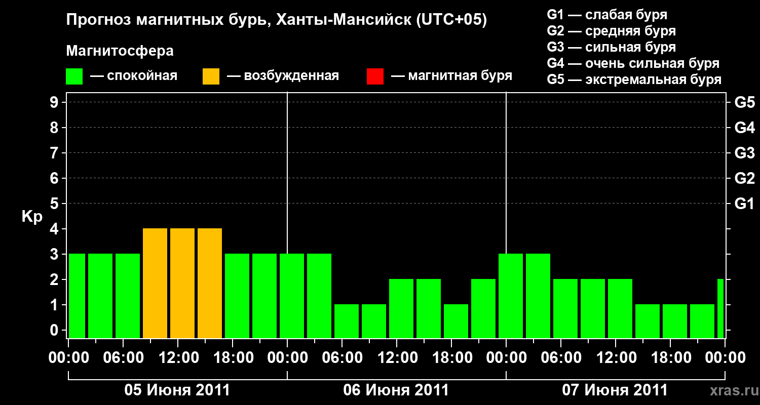 Прогноз магнитных бурь в Ханты-Мансийске на 5 июня 2011 года