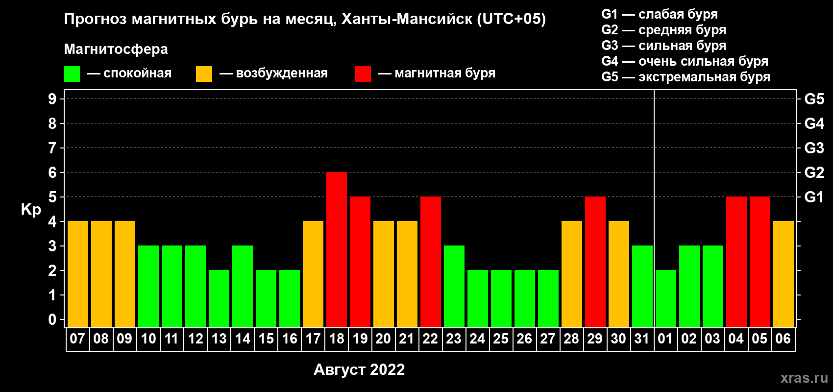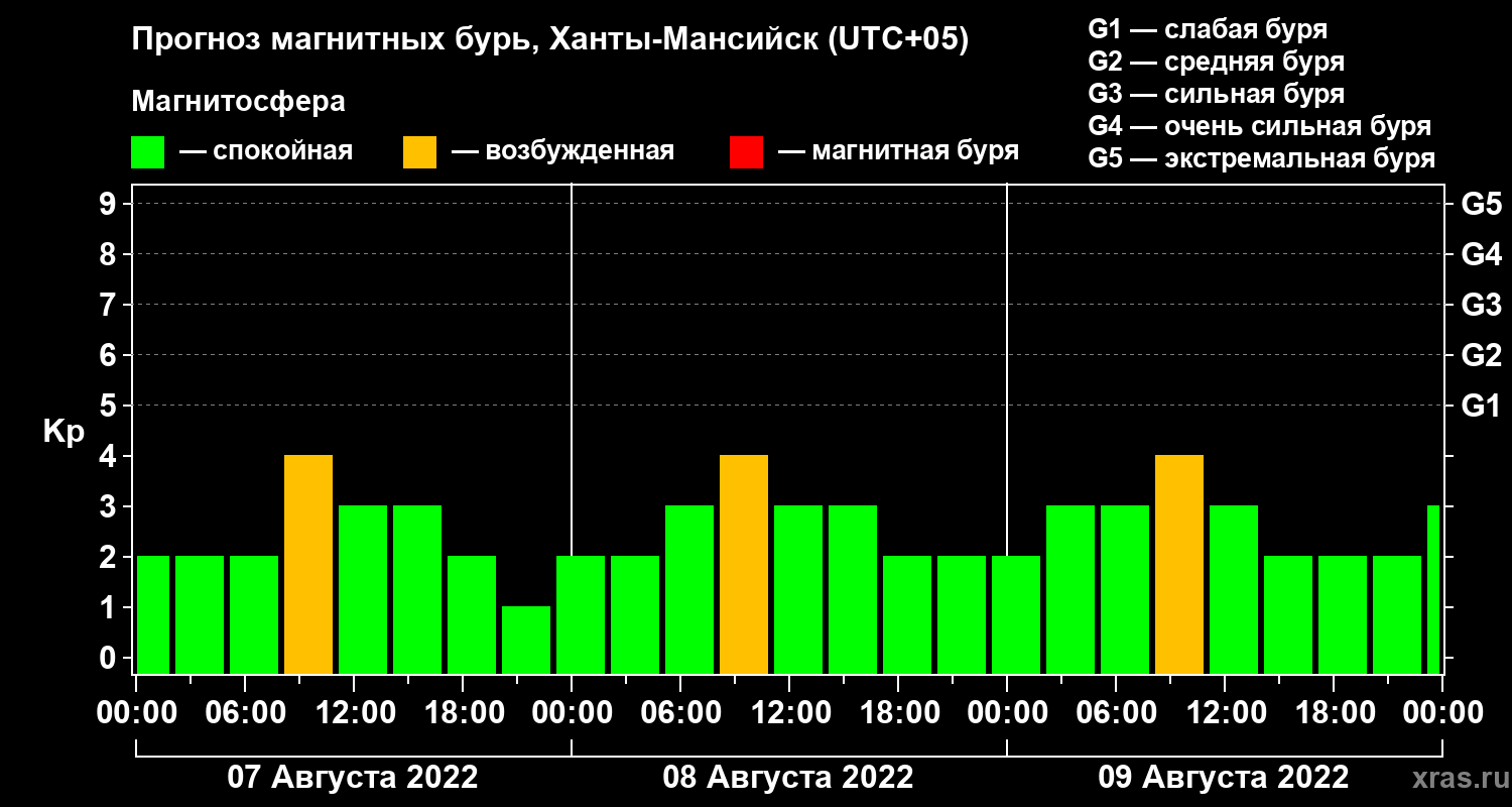 Прогноз магнитных бурь в Ханты-Мансийске на 7 августа 2022 года