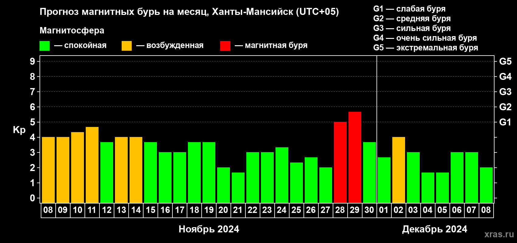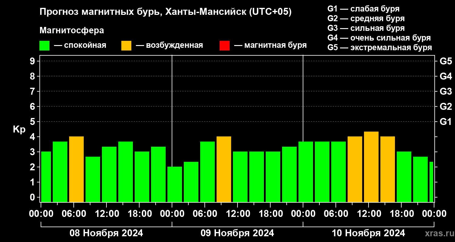 Прогноз магнитных бурь в Ханты-Мансийске на 8 ноября 2024 года