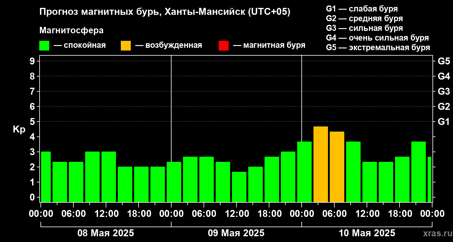 Прогноз магнитных бурь в Ханты-Мансийске на 8 мая 2025 года