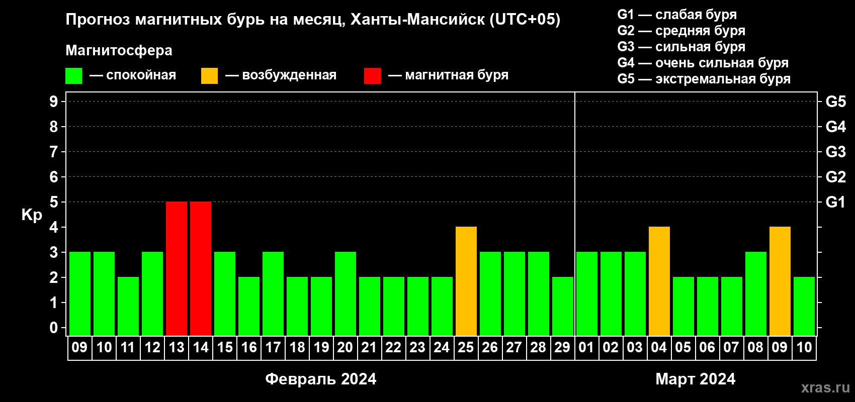 Прогноз магнитных бурь в Ханты-Мансийске на 9 февраля 2024 года