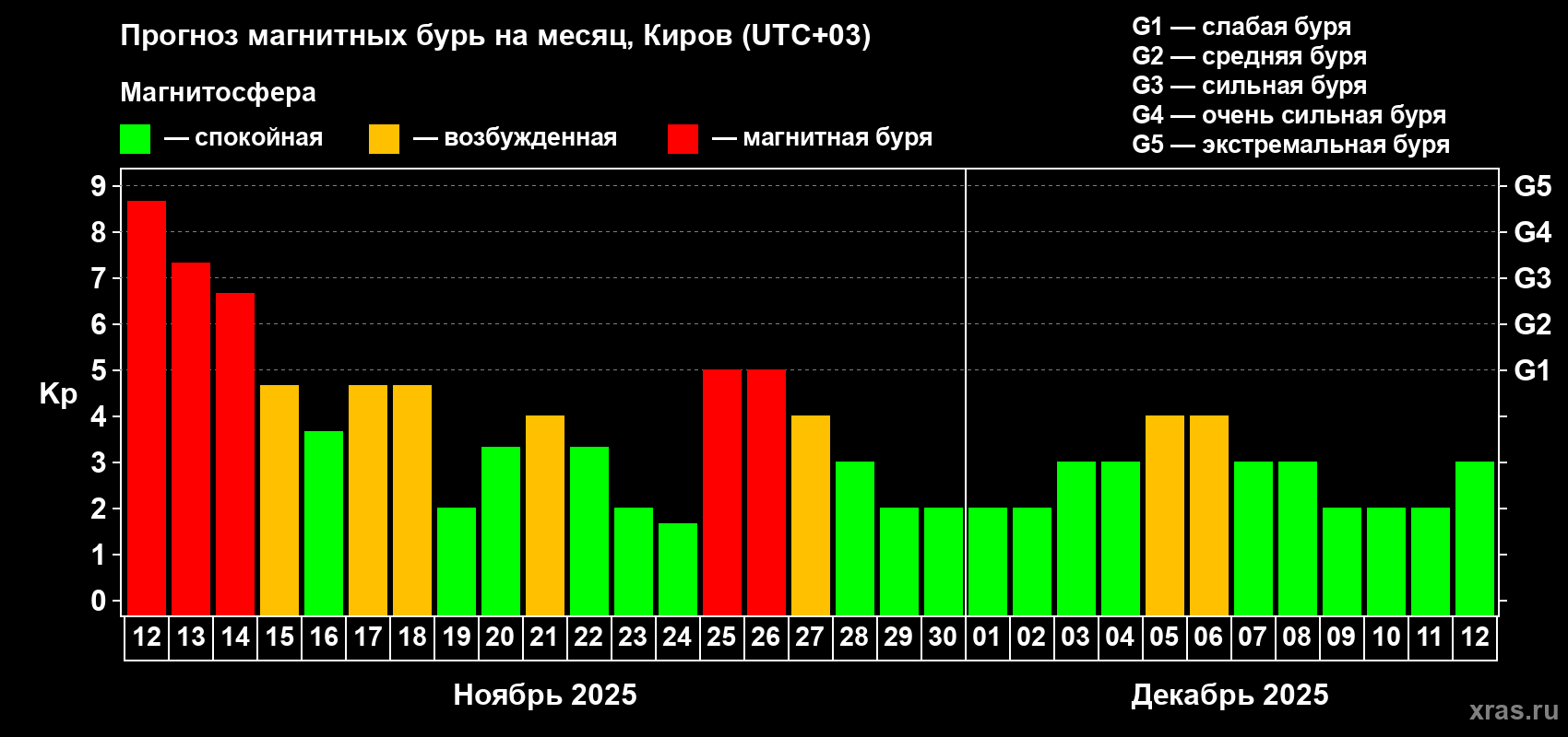 Прогноз магнитных бурь в Кирове — 12 ноября 2025 года