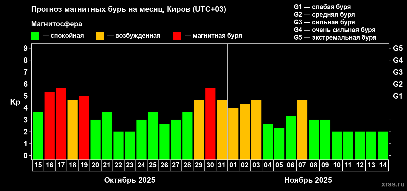 Прогноз магнитных бурь в Кирове — 15 октября 2025 года