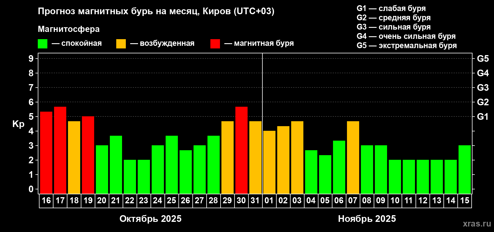 Прогноз магнитных бурь в Кирове — 16 октября 2025 года