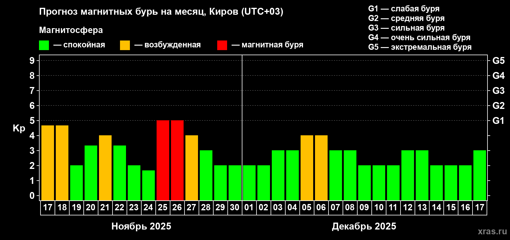 Прогноз магнитных бурь в Кирове — 17 ноября 2025 года