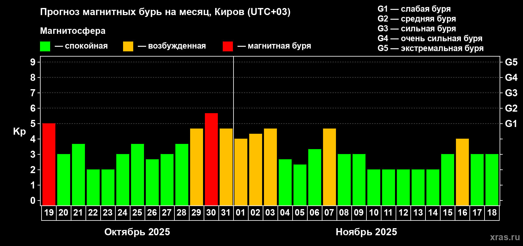 Прогноз магнитных бурь в Кирове — 19 октября 2025 года