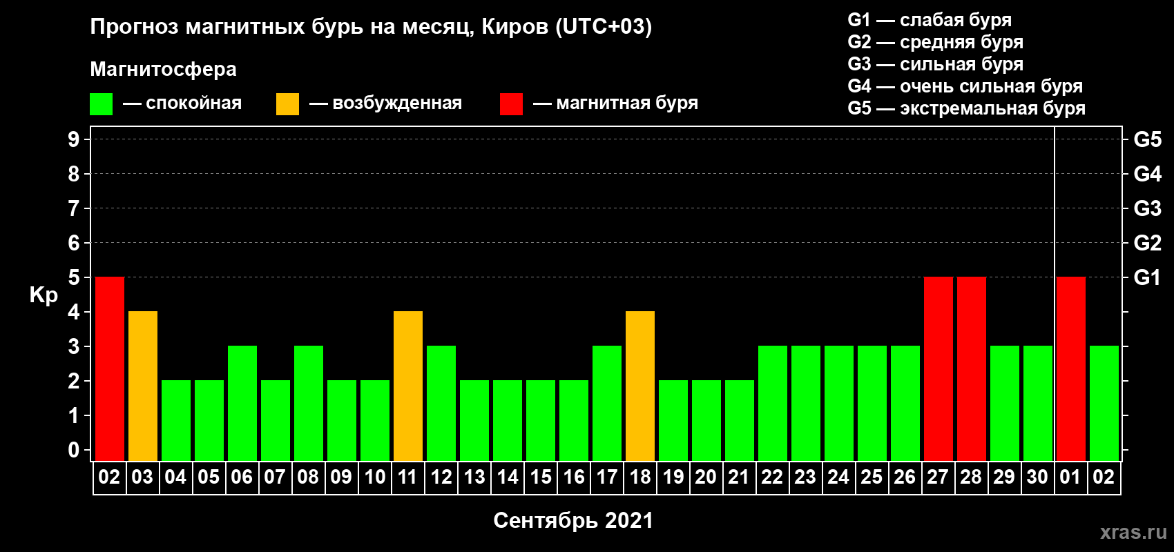 Прогноз магнитных бурь в Кирове — 2 сентября 2021 года
