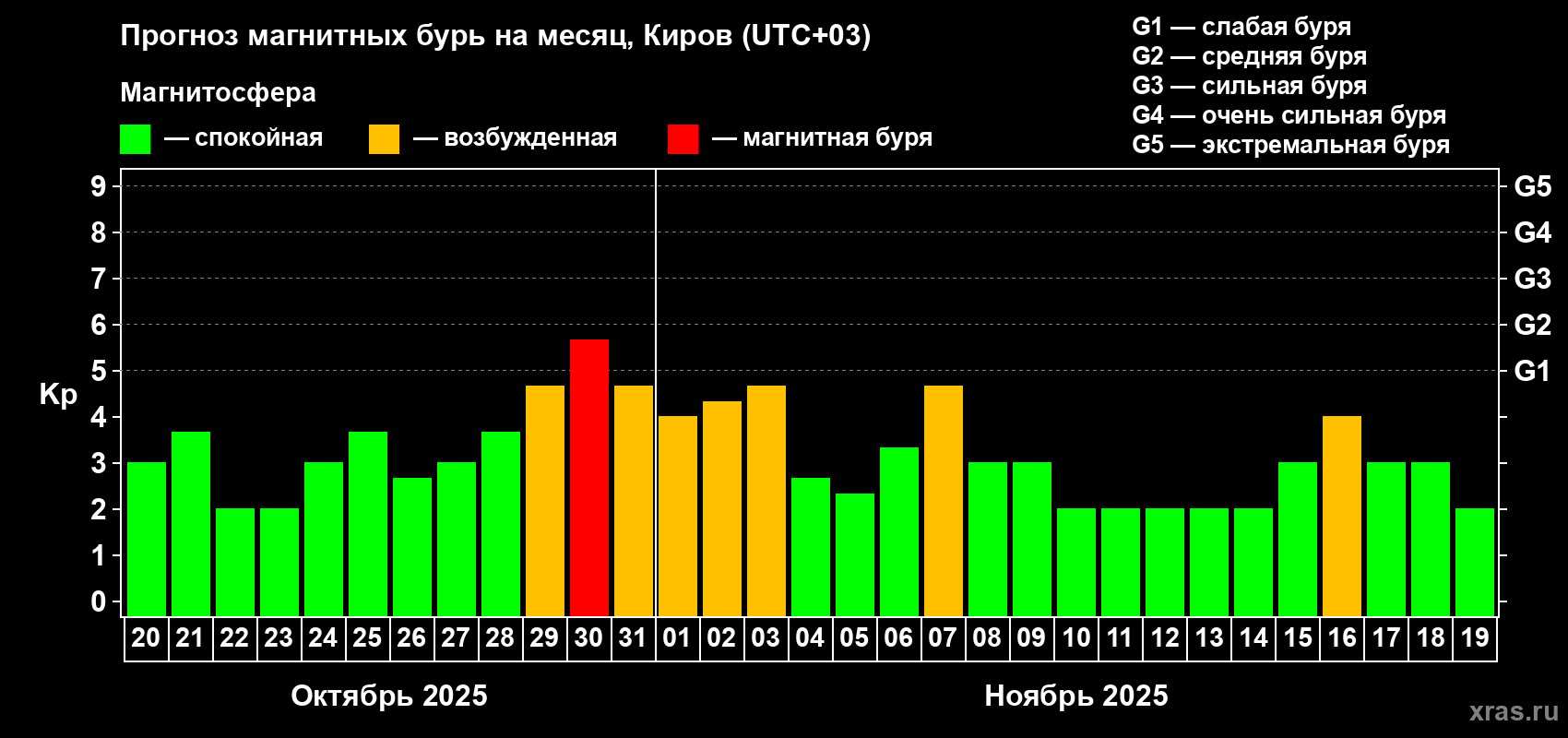 Прогноз магнитных бурь в Кирове — 20 октября 2025 года