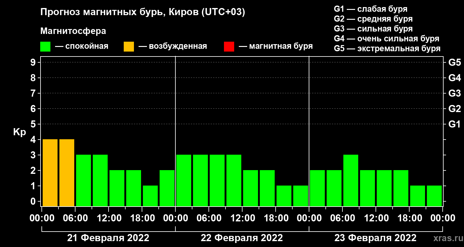 Прогноз магнитных бурь в Кирове на 21 февраля 2022 года