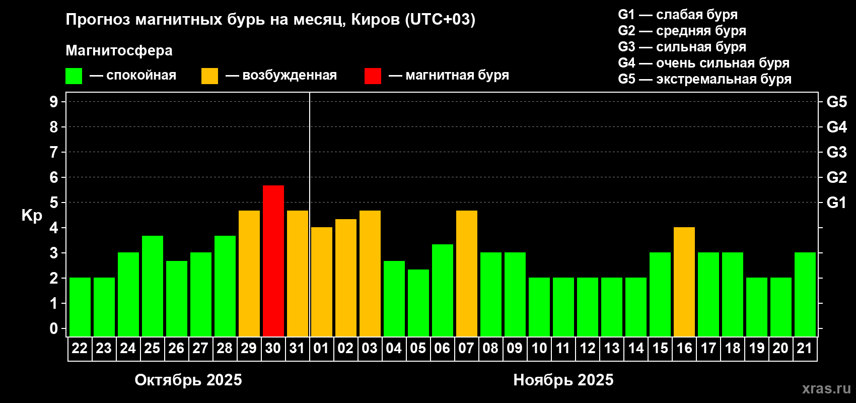 Прогноз магнитных бурь в Кирове на 22 октября 2025 года