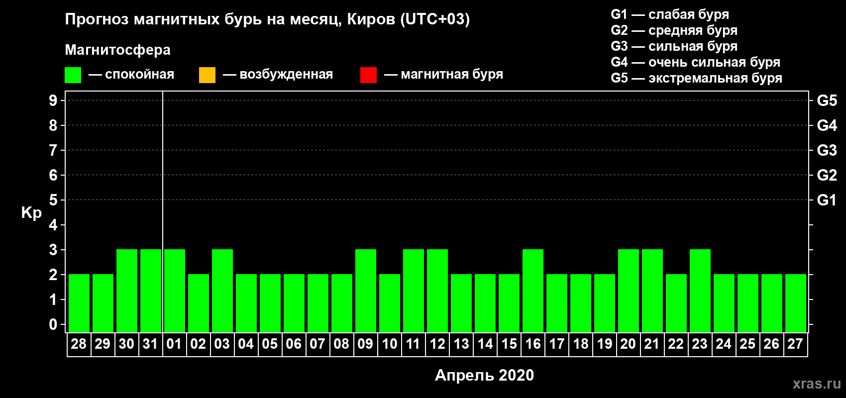 Прогноз максимального суточного геомагнитного индекса Kp на 1 месяц (31 день) с 28 марта по 27 апреля 2020 г