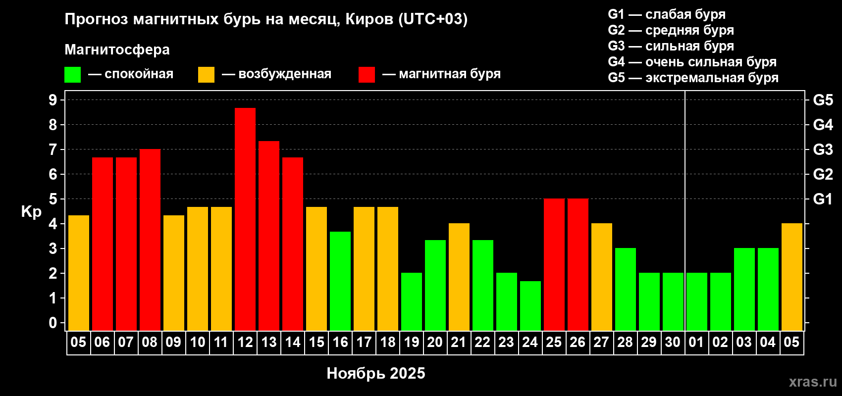 Прогноз магнитных бурь в Кирове на 5 ноября 2025 года