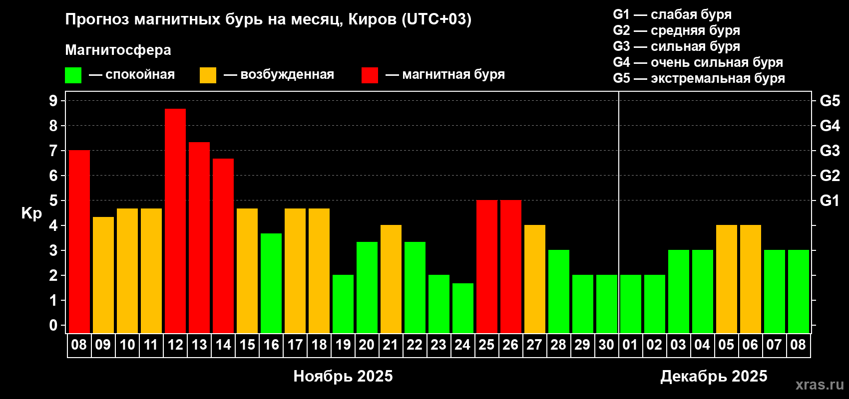 Прогноз магнитных бурь в Кирове на 8 ноября 2025 года