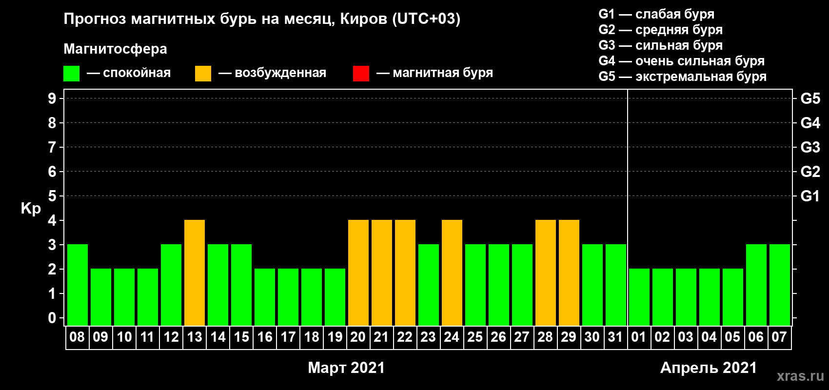 Прогноз максимального суточного геомагнитного индекса Kp на 1 месяц (31 день) с 08 марта по 07 апреля 2021 г