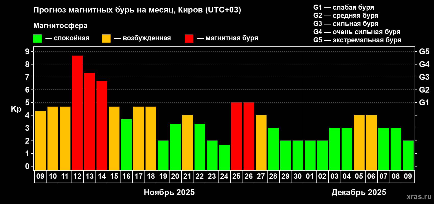 Прогноз магнитных бурь в Кирове на 9 ноября 2025 года
