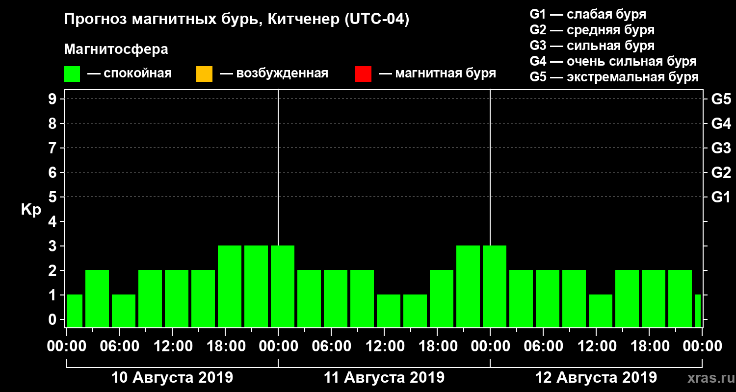 Прогноз магнитных бурь в Китченере на 10 августа 2019 года