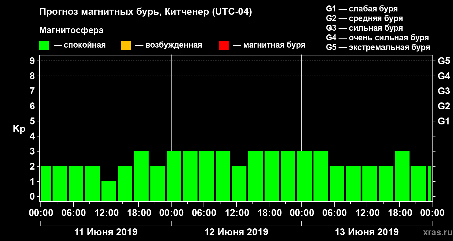 Прогноз магнитных бурь в Китченере на 11 июня 2019 года