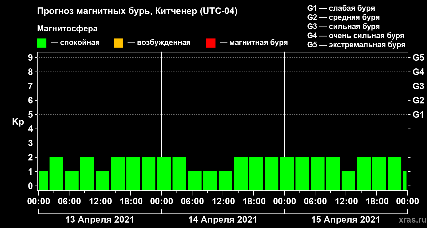 Прогноз магнитных бурь в Китченере на 13 апреля 2021 года