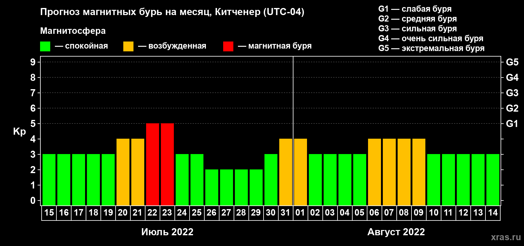 Прогноз магнитных бурь в Китченере — 15 июля 2022 года